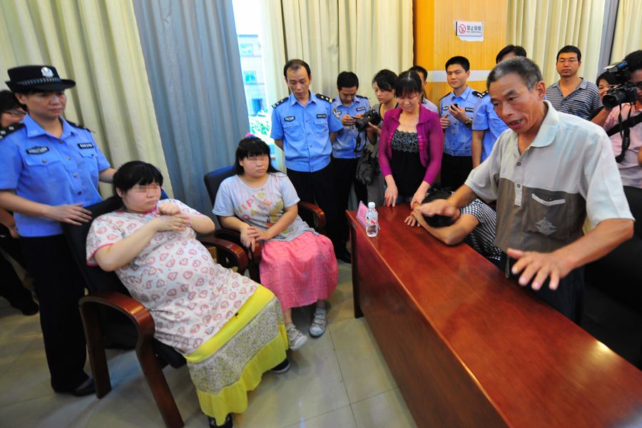 7月31日,被拐5年的双胞胎姐妹的父亲孙义直(右一)无法接受女儿现状,表示不想认领。5年前,在石狮,小美和小甜被父亲托付给在服装厂打工的漳州云霄人吴金石学做衣服,不料被吴金石伙同工友拐走“当老婆”。7月30日,石狮警方在广东汕头将这对双胞胎姐妹成功解救。此时,双胞胎姐妹已经19岁,而且小甜已怀孕8个多月。