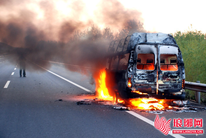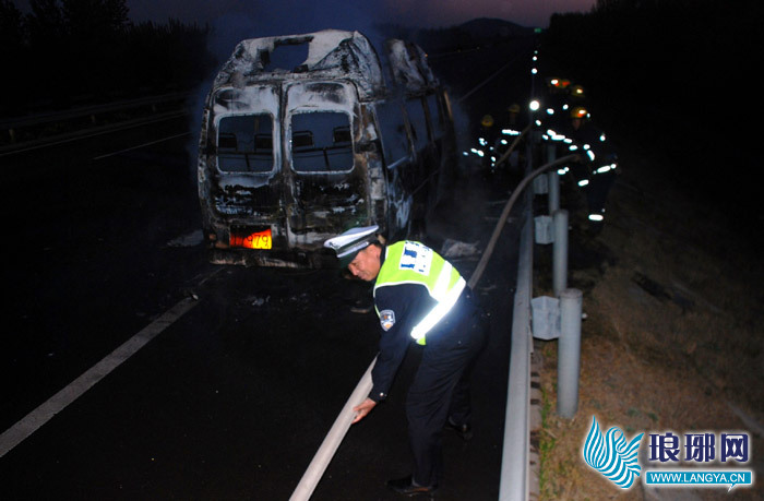 4月27日18时40分许,济青高速公路沂水交警大队接到报警,一辆搭载十多人的客车在沂水辖区发生自燃,火势很大,请求处理。民警火速赶往现场,实施交通管制,同时联系沂水县消防大队赶赴现场。