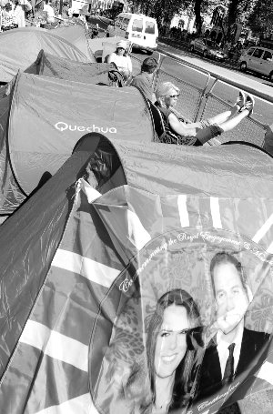 在威斯敏斯特教堂外,人们搭帐篷敬候新人。新华社发