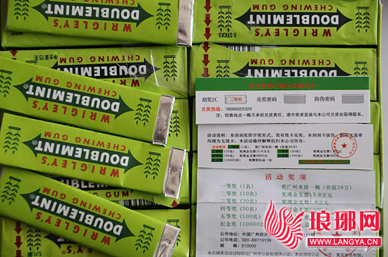 琅琊网4月28日讯(记者张娜 通讯员高洪方)近期,有消费者反映,部分商场销售的箭牌口香糖出现“中奖”等字样,其中一等奖一名,为广州本田轿车一辆(价值28万元),二等奖十名,奖现金支票15.8万元,三、四等奖均有不同程度的奖金,声称本次抽奖活动经过广州市公证处现场公证,本次活动公正、公平、真实有效,并在中奖卡上留有公证电话。