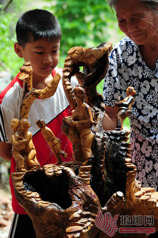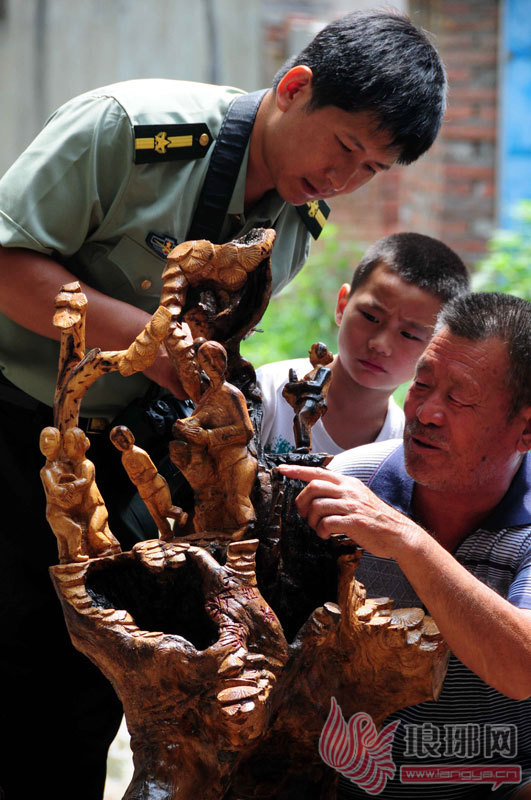 7月31日,村民在观看“老兵”刘宗渠制作的根雕“沂蒙六姐妹”。