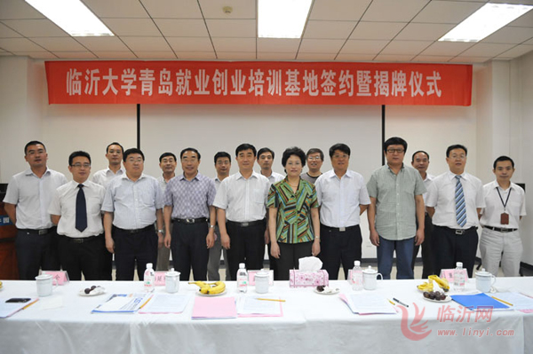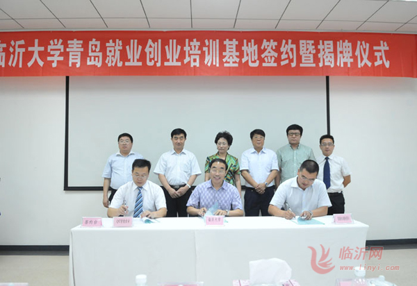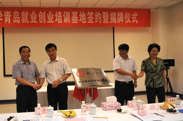 韩延明代表临沂大学分别与李战军、胡志刚签订协议;丁凤云、韩延明、盖健、董肇胥共同为“临沂大学青岛就业创业培训基地”揭牌。