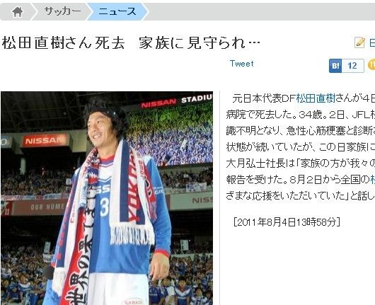 新浪体育讯 北京时间8月4日,2002世界杯上的日本国家队后卫松田直树因在本月2日训练中突发心肌梗塞,经医治无效后于今日凌晨逝世,终年34岁。