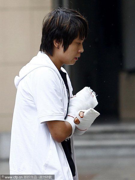 图为7月29日,冬季中心在北京就短道内讧事件召开第2次会议,王濛手缠绷带现身。
