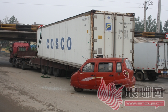 集装箱货车过桥“卡壳” 殃及车后机动三轮