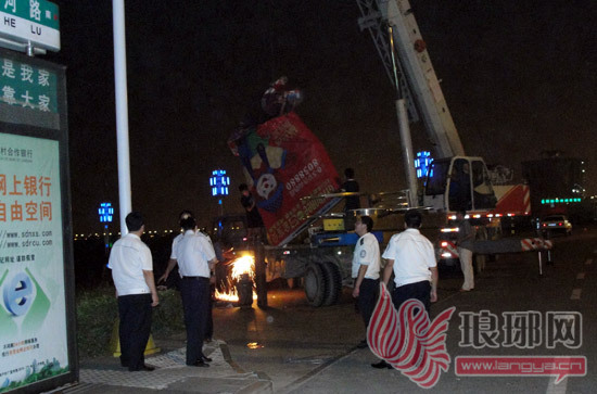 临沂城管滨河景区夜间拆除违规广告扣渣土车