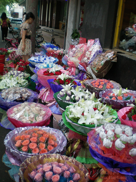 红玫瑰、白玫瑰、粉红玫瑰、蓝色妖姬……记者在银雀山路中段看到一家花店门口摆满了各色玫瑰花,散装的玫瑰和包装精美的花束。据花店老板薛女士介绍,红玫瑰10元一支,地上摆好的玫瑰花束100—300元一捧。市民可以提前订购,有八折优惠。