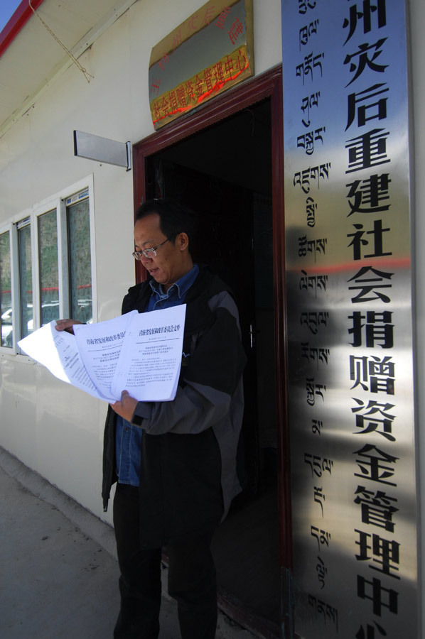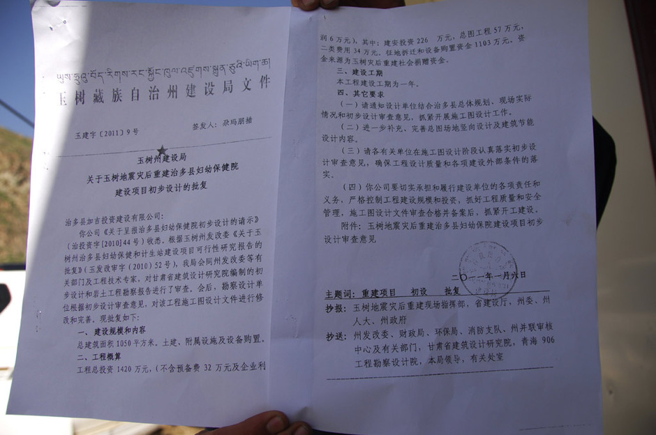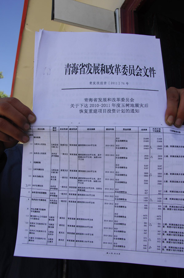 8月6日,青海省红十字会办公室副主任任富民在玉树州灾后重建社会捐赠资金管理中心办公室门口展示3份证明治多县妇幼保健院建筑面积的文件。据了解,此次引发网络关注的焦点主要集中在杂多县妇幼保健院和治多县妇幼保健院。根据中国红十字总会公布的信息,这两所妇幼保健院的总投资均为1420万元,但杂多县妇幼保健院建筑总面积为1050平方米,治多县妇幼保健院建筑总面积则为5600平方米。细心的网友发现,同在玉树地区,同为县级妇幼保健院,同样的投资总额,但建筑面积却相差5倍以上。以此核算,两所妇幼保健院的造价相差高达5倍。