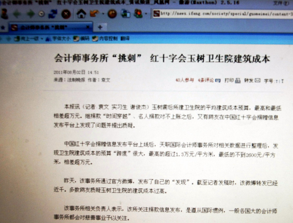 网上报道“会计师事务所‘挑刺’ 红十字会玉树卫生院建筑成本”的新闻(8月7日摄)。 陕西省社会科学院社会学所副研究员尹小俊建议,中国公益慈善组织应从粗放式管理向精细化管理转变。公益组织对公众需求的尊重在于秉持一种耐心、细致的工作态度及采取精细化的工作手法。同时,公益慈善组织还应建立与公众日常联系交流的沟通机制和互动平台,厘清捐赠者与慈善机构之间的关系及其所处位置。慈善机构应遵循自身运转的逻辑与回应社会需求的逻辑相互结合的规则,以帮助其更好倾听公众的声音,并从公众需求入手,评估公众需求的重点和习惯,以一种服务公众的状态去满足慈善公益事业发展的要求。
