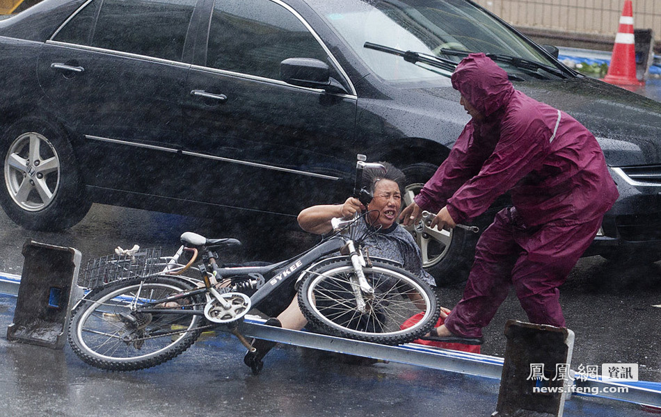 8月7日,台风“梅花”袭击江苏启东,骑行的市民被狂风吹倒。
