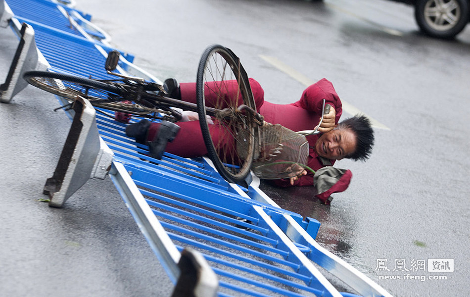 骑行的市民被狂风吹倒。