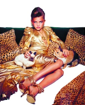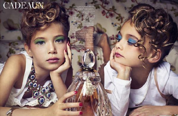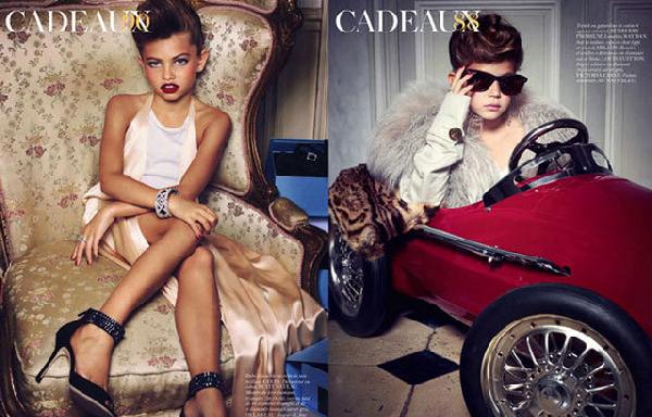 时尚杂志法国版《Vogue Enfant》最新一期的封面模特是一名10岁嫩模戴兰·布隆多。和大家印象中天真单纯的孩子不同,封面上戴兰涂着红唇膏,身穿深V领裙子和高跟鞋斜倚在豹纹枕头上,表情冷酷地摆出姿势,性感程度媲美成年模特儿。照片中,她对肢体语言的拿捏恰到好处,眼神中带着纯真的诱惑。布隆多的出现横扫了世界时装界,颠覆了所有人对于儿童模特的印象,她也成为有史以来年龄最小的模特。