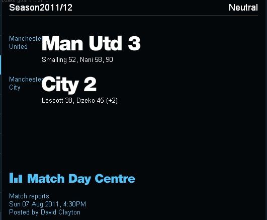 然而或许是还沉浸在2比0领先的喜悦之中,又或许是还未从被逆转的阴影中走出,曼城官方网站竟然在本场比赛结束之后,甚至是曼联全队高举社区盾杯的庆祝仪式之后,仍显示着曼联2比3负于曼城的比分头条,而且为了渲染“胜利”的气氛,曼城官方网站还特意拿出了哲科和里查兹相拥庆祝进球的画面,作为这条头条战报的背景图,可谓是摆了一个天大的乌龙。《每日邮报》干脆带着调侃的语气对曼城官网揶揄道:“你们是怎么看的这场比赛?”