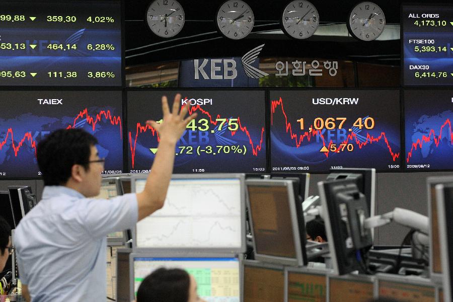 8月5日,在韩国首都首尔,交易员在股指显示屏前工作。受隔夜美国和欧洲股市全面下挫等因素打压,5日亚太地区主要股指应声下跌,集体重挫。韩国首尔股市综合指数下跌74.72点,收于1943.75点,跌幅为3.7%。新华社发(朴真熙摄)