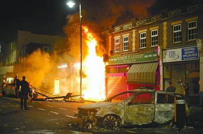 一场在伦敦城北举行的示威活动8月6日晚间突然演变为暴力事件,100多名青年在夜色中焚烧警车、公共汽车和沿街建筑,切断交通,占领高速路,劫掠数十家店铺。