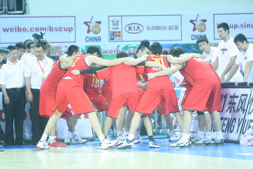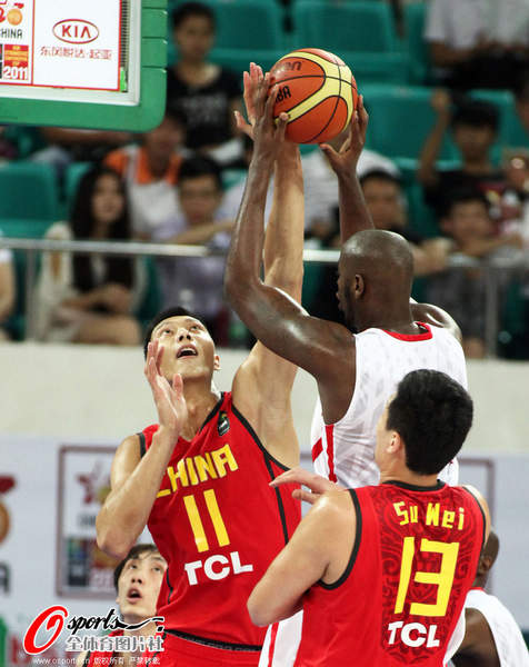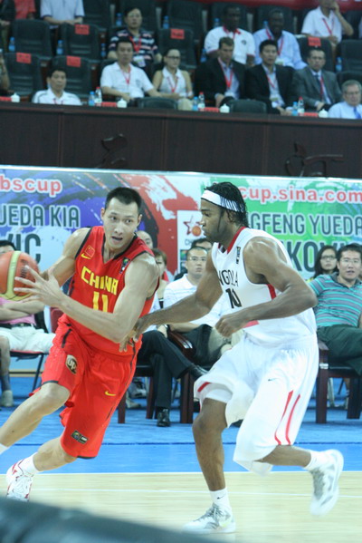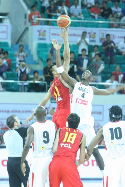 北京时间8月9日晚,2011年斯杯广州站最后一天的比赛在广州天河体育馆举行。中国男篮在三四名决赛中迎战安哥拉队。图为比赛现场图。