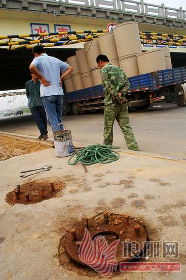 9日上午9点,记者赶到沂河路与滨河路交会处光耀大桥下,看到一辆挂江苏牌照、载重15.99吨的中型货车卡在了桥下面,车上满载着28个巨大的包装纸筒。由于撞击力过大,车厢顶上的两个纸筒倒在了路中央。撞歪倒后严重变形的限高架已被拉走。司机和两个帮手正把散落在路中央的纸筒移到路边。