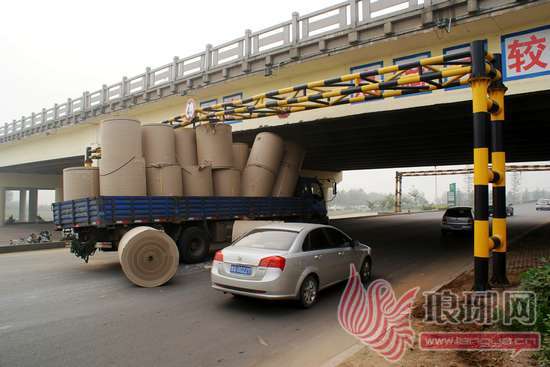 一辆满载纸筒的大货车停在桥下滨河路的中间,被限高架给卡住了,车上的两卷纸筒掉落在路上。