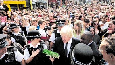 英国媒体10日报道,伦敦市长约翰逊9日出现在伦敦街头,手举一把绿色扫把,许多在暴乱中遭受损失的市民“围攻”他以示抗议。