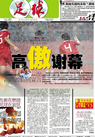 高洪波:我特别在和队员交流的时候谈到了,我们在分别的时候不要太煽情,大家要更务实一些,接受现实吧。这两年和大家在一起的时间我非常开心,无论是球员还是球迷对我的工作都非常支持,这让我很感动。中国足球还是得从长远发展来考虑,我个人的观点是,不要因为我的离开影响到后面的工作。我个人更希望大家不要有更多个人情绪掺杂到里面,大家还是多些业务交流吧。