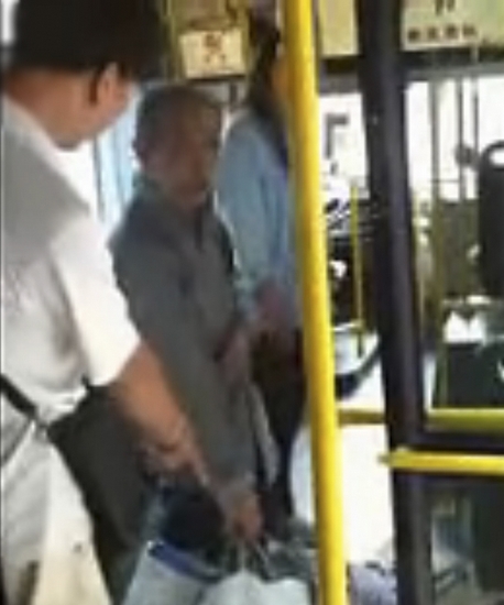 “你不要仗着你年纪大哦。”男乘客说着迅速拿起老者的袋子,试图扔出车外。但被老人夺下,没有成功。