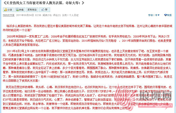 8月4日,翠翠在网络空间发表日志:《义堂伤残女工当街被老板带人撕光衣服,奇耻大辱!》在这篇日志里,翠翠痛问:“这片让我心痛的外表华丽的城市何时能还我一个公道?”“那一刻我没有力气反抗,我想喊想挣扎却是那么的无力,我只能抱着自己的头让他们折磨,那种痛是痛在心里,我完全忘记了身上的痛,多少个目光看着我,周围围满了群众,那种眼神我害怕,我痛恨,仿佛最深处的秘密全被人看穿,那种感觉就好像被人当中(当众)强奸了一样吧!那一刻真的好想去死,我恨,我恨这些人,我只能无力的躺在地上哭,似乎哭的力气都没有了,那一刻我的脑袋都要炸了!”
