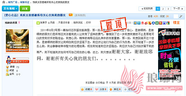 8月7日,翠翠在琅琊网临沂社区注册“残缺的双翼”发帖感谢所有关心和支持她的网友们,“2011年8月2号那一幕始终还存留在脑海里,那一刻,我对这个社会失去了信心,是琅琊网,是琅琊网的朋友们,是所有还关注着我的人让我有了坚持的勇气,事情到了这一步我想我要的不止是那笔可以改变我双手的赔偿金,我想心灵,精神的侮辱远远比身体的伤害重要,那一刻,我想到离开这个世界,是琅琊网的朋友让我明白我应该坚强下去,我应该让他们为自己的行为负责,我不知道下一步该怎么做,我会静静地等待警方的处理结果,现在我知道我应该坚强些,我应该为自己讨回该属于我的尊严,我不知道我该如何书写自己现在的心情,总之,我只想说谢谢大家,谢谢琅琊网,谢谢所有关心我的朋友们。”