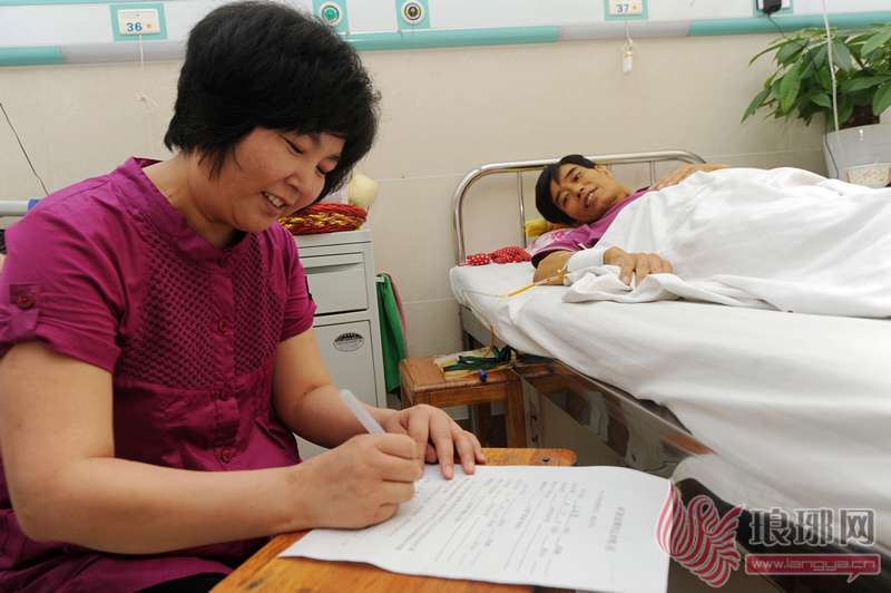病床上的王经涛一脸笑容的看着妻子在申请结婚登记声明书上签下自己的名字。