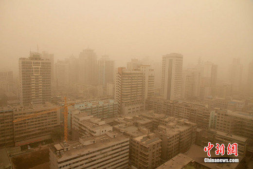 中新社北京4月29日电 (阮煜琳 吕玮)中国北方地区遭沙尘天气席卷。目前,中国新疆、内蒙古、甘肃、青海、宁夏、陕西、山西7省区部分地区遭遇沙尘天气,部分地区出现沙尘暴。中央气象台预计,29日夜间到30日白天,沙尘天气还将袭击华北大部地区,北京、河北等地将有扬沙或浮尘天气。