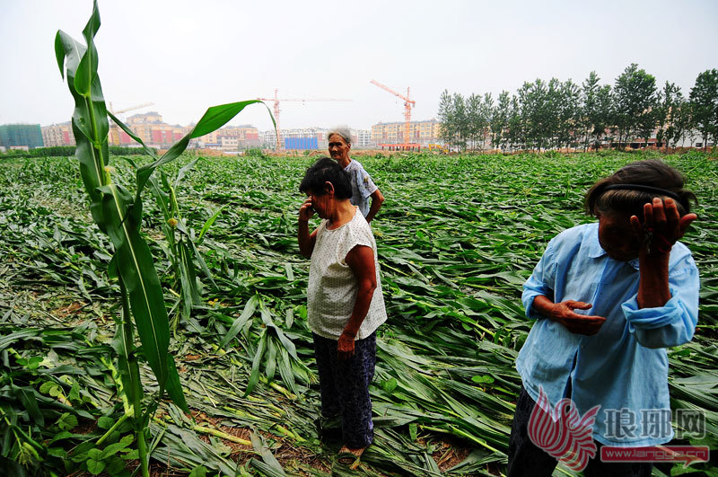 14日上午11时,记者赶到郯城县城东的后八庙街村,在村西北的一片地上,大片的玉米被碾倒在地,地面上还有大型机器碾轧过的轮胎印,不少村民看着被轧坏的玉米抹眼泪。