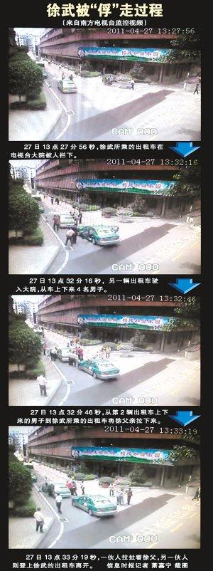 当天下午1时30分左右,徐武接受了《拍案惊奇》栏目的采访,在大院内搭乘出租车准备前往另一家媒体时,突然,有七八名不明身份的人打开他们的车门,一左一右钻进车,将徐武夹在中间,并让司机开车走。