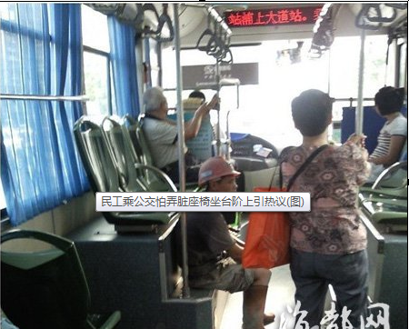 “321路上 ,一位不想弄脏座椅的民工兄弟,他才是城市的真正主人。”——12日中午,网友“好瘦的胖仔”在自己的微博上传了一张照片,照片中,一位头戴安全帽的民工坐在公交车前排的台阶上,而他的身后,是空着的一排公交座椅。“好瘦的胖仔”描述,民工兄弟此举是不想把座椅弄脏。该微博引来网友热议和转发,不少网友对这位民工兄弟致敬。一位网友评论:“可爱可敬的人!人家这才叫素质,向他敬礼!”网友“郑斌彪”留言:“方便他人也方便自己!特有社会公德心的民工!”网友Yeemail感慨:“心灵纯净的人才是真正的高尚!”更有网友直言:“衣着干净,内在肮脏的人比比皆是”,民工平凡的举动让人动容,也让不少人脸红和难堪。