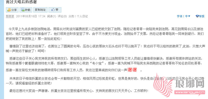 “感谢这些日子关心我支持我的所有网友们,那些陌生的好心人,感谢兰山法院领导工作人员能让事情很快解决,感谢所有媒体网站的关注,特别感谢那个戴着眼镜帅帅老大哥,感谢那一直特关心我的‘韦小宝’,感谢一直为我喊不平陪我东奔西跑的记者哥哥和不知名的司机哥哥,感谢一直在背后支持我的琅琊网领导们和所有工作人员,我在这里真诚的向你们说一声谢谢。”日志中邢翠翠写道,事情有了满意的结局,邢翠翠十分感谢网友的支持和帮助。邢翠翠说,在最初的时候她非常伤心,面对一次次的打击都丧失了信心,就在最困难的时候,网友们伸出了爱心的双手、开导她、安慰她,让她有了重新站立起来的勇气。