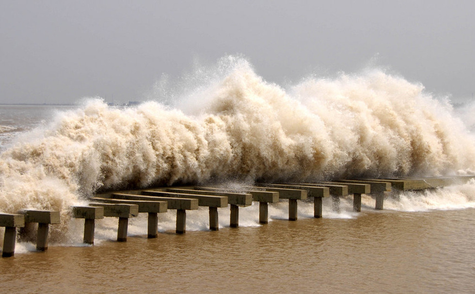 8月17日,浙江海宁市钱塘江北岸沿线大潮汹涌。
