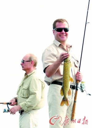 8月16日,俄罗斯总统梅德韦杰夫和总理普京在伏尔加河垂钓。