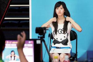 10点50分,章泽天身穿一件印有Hello kitty的白色T恤,来到学校综合体育馆拍证件照。