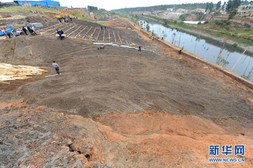 记者日前来到离厂区不远的一个由铬渣堆成的斜坡上,看到一群工人正忙着用石棉瓦搭建防雨层,巨大的铬渣堆与南盘江之间仅隔一段砖砌的约一米高挡墙。陆良化工实业有限公司总经理汤再杨说:“2003年收购这个厂的时候,铬渣就在这里了,总共28.84万吨,工人们也都知道,起码10年多了。我们争取了两个国家项目来处理这些铬渣,目前还剩下一半没有处理掉。”