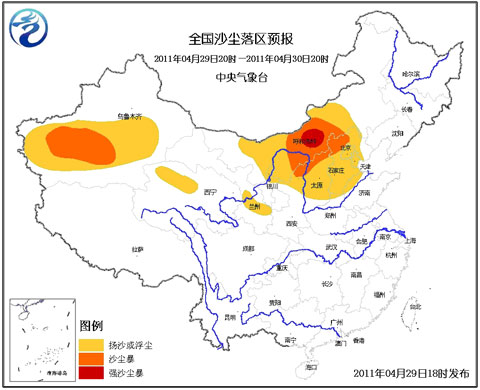 29日20时至30日20时,新疆天山西部和我国中东部大部地区有小到中雨或雷阵雨,其中,江南中北部和西部、广西南部和东北部、海南北部等地的部分地区有大雨,局地有暴雨。新疆南部、青海柴达木盆地、甘肃南部、内蒙古中西部、宁夏北部、陕西北部、华北大部等地的部分地区将有扬沙或浮尘天气,局地有沙尘暴或强沙尘暴,上述地区并伴有5~7级偏北风,阵风可达8~10级。黄海海域有7~8级、阵风9级的西南风。