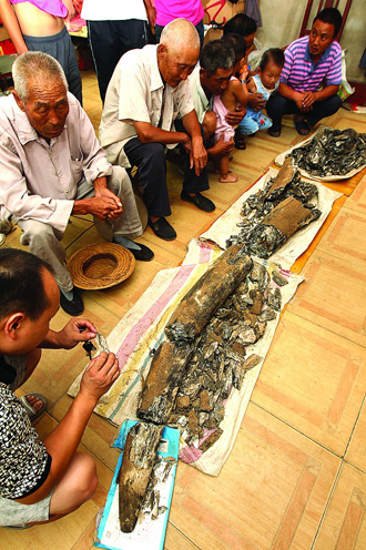 看到这个黑乎乎的东西有些稀奇,解学涛赶紧打电话找来父亲、表哥等五个人,拿着铁锹挖了三个多小时,终于将这个东西从河里挖了出来。大家发现这个东西是半圆形,看起来非常像大象的牙,上面摸起来粘糊糊的。当时天已经差不多全黑了,几个人一合计,先用面包车将挖出来的东西拉回家。“这个巨牙非常沉,最粗的地方直径大约30多公分,我们五个人抬着非常吃力。”解学涛回忆道。他说,当时巨牙挖出来的时候看起来是完好无损的,但是没想到一搬就断了,到车上拉回家的时候已经断成了几节。
