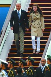美国副总统拜登17日抵达北京,图为拜登与女儿走下飞机。