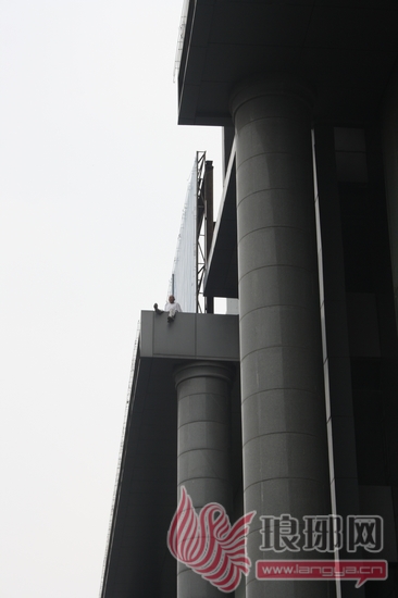 老年男子坐在高十几米的高层平台上。