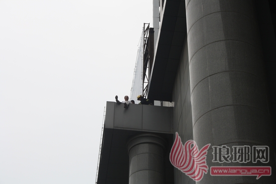 18日上午10时,晚报接到市民电话,反映解放路华通国际商务大厦有人要跳楼,记者随后赶到现场。在华通国际商务大厦C座高十余米的平台上,记者看到一老年男子正坐在上面,双腿搭在平台边缘,欲跳下。该男子约60余岁,身穿白色衣服。此时公安、消防部门已来到现场,对现场进行了封锁,并准备对其进行营救。