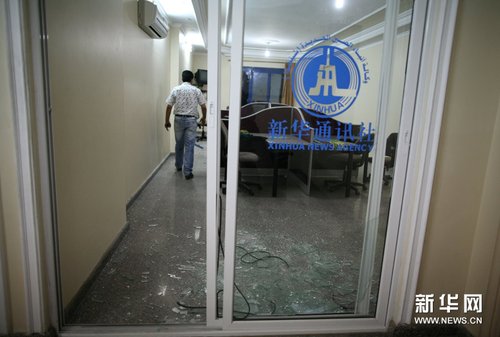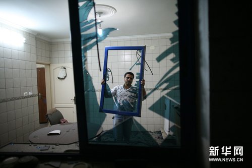 为报复以色列南部系列袭击事件,以色列军队18日和19日凌晨向加沙地带多处发动空袭,造成至少6人死亡。位于哈马斯安全据点附近的新华社加沙分社办公室受到波及,外墙玻璃破碎,门窗脱落,所幸未造成人员伤亡。新华社发(维萨姆纳赛尔摄)