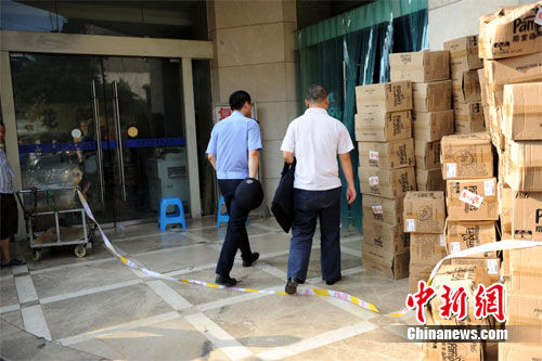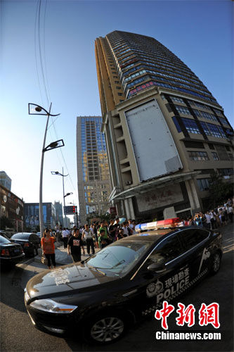 重庆警方通报,19日下午2时20分重庆市江北区观音桥某汽车租赁公司,发生一起入室抢劫案。犯罪嫌疑人抢劫后逃逸,现场无人员伤亡。目前警方正在全力侦办此案。记者赶赴事发地看到,警察已经封锁了该楼,不少市民顶着烈日在一旁围观。曹多然 摄