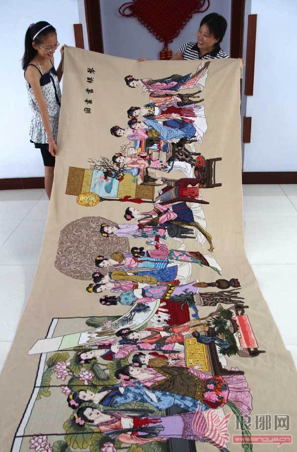 当日,山东省沂南县41岁的下岗女工李永花历时三年时间创作的十字绣《琴棋书画》完成,在这幅长3.6米、宽1.5米的十字绣作品上,绣制了18名古代美女在切磋琴、棋、书、画的美丽场景,画中人物栩栩如生,场面壮观典雅。