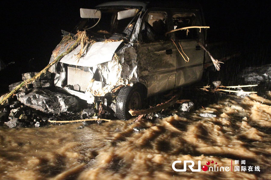 2011年8月22日晚,209国道湖北省兴山县苍坪河路段,一辆被山洪冲毁的小货车。当天下午,受强降雨影响,被中断的209国道兴山至神农架路段抢修受影响,神(农架)宜(昌)生态旅游路沿途堆积如山的泥沙和数十上百吨的巨石。当地政府组织公安、武警、消防、路政及机关干部全力投入抗灾,恢复交通转动被困群众。