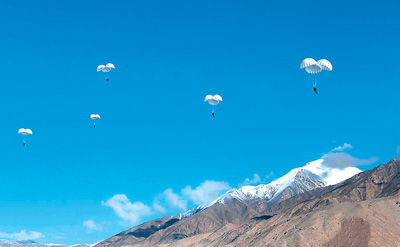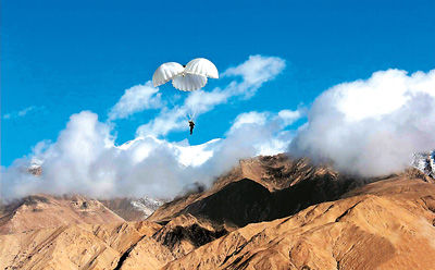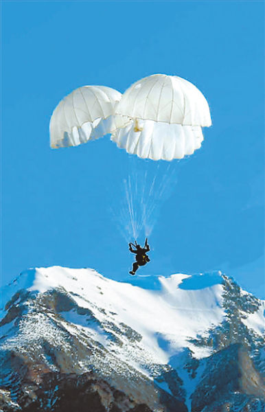 上午10时,西北高原海拔4200米的某地上空,远处的雪山与蓝天白云构成一幅美丽的图景。伴着一阵阵直升机的轰鸣声,18名全副武装的伞兵士气高昂、待命出击,演练总指挥、部队长王军贤在简短动员后,自信地告诉记者:今天的伞降没有任何问题,底气来自艰辛、充分的准备。针对高原高寒的气候特点,早在6月10日他们就进驻该地域提前进行适应性训练,先后探索展开抗高原缺氧、抗旋晕、抗低气压以及增加耐力、生存力等50多种训练科目,攻克了高原气候不稳定、开伞时间相对平原延长、着陆产生拖拉、冲击力大等20多个难题,在实验地域先后进行了实物、活物等不同高度、重量、伞型反复试验,取得一大批数据后,实施伞兵实跳。