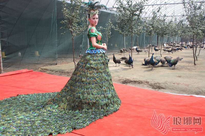 22日上午,在罗庄区一孔雀养殖基地,一场别开生面的婚纱展示会在这里举行。记者看到一模特身穿一身绿色的婚纱。与普通婚纱不同的是,婚纱的裙摆上全部是孔雀的羽毛。每一片羽毛上有五色金翠线纹,由紫、蓝、褐、黄、红等颜色组成。身穿此身婚纱宛如一只孔雀开屏。