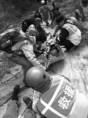 昨日,蓝天救援队将受伤的刘大爷固定在担架上运送下山。蓝天救援队供图