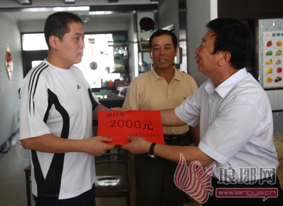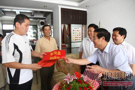 23日上午,临沂市见义勇为基金会理事长李荣强、市政法委综治办副主任卢兆荣、兰山区见义勇为基金会主任刘俊成等领导来到姚亮家中对他表示了慰问,并为姚亮送上了5000元的慰问金。